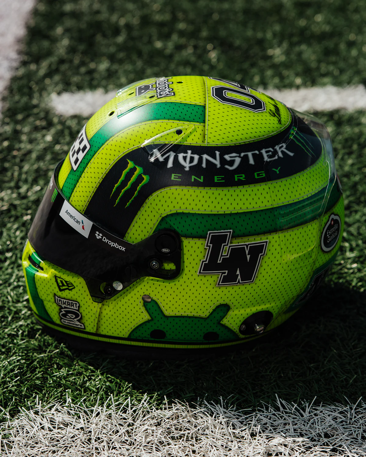 Images are of Lando's full scale 2025 Austin helmet, sponsor logos and their position may vary on the replicas.