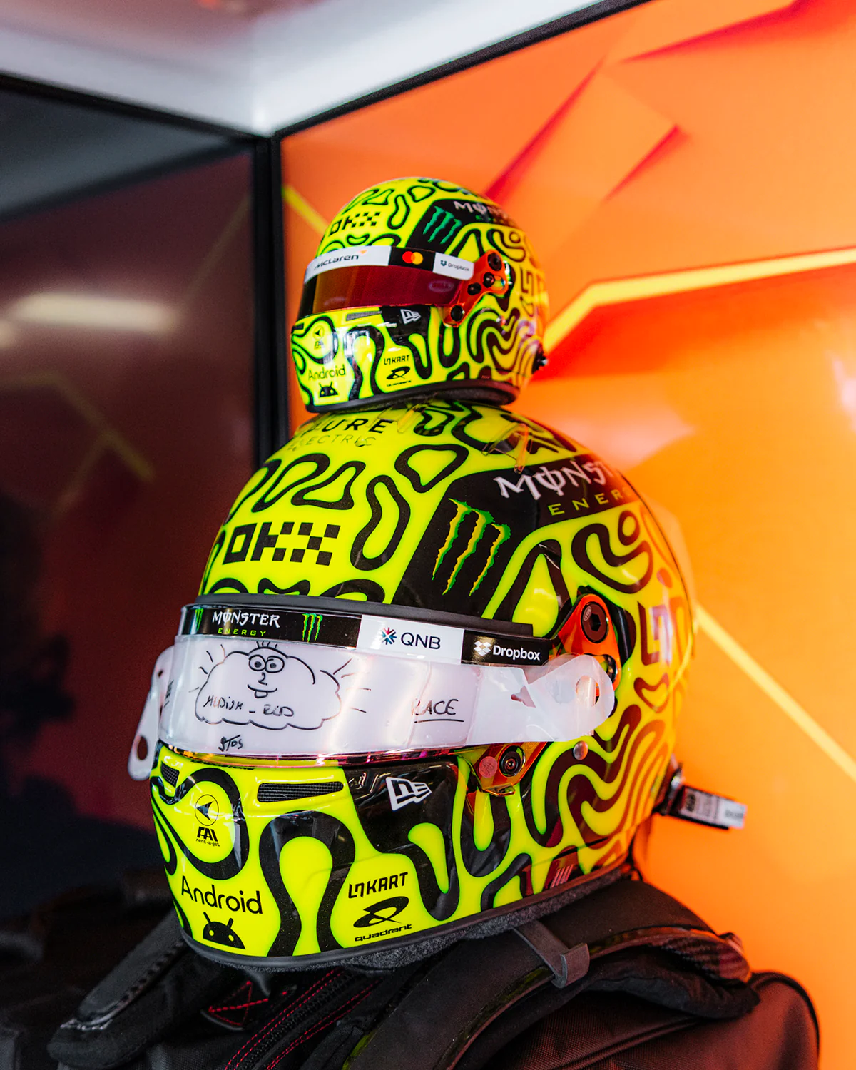 BLOBS ARE BACK. Introducing the 2025 Lando Norris 1:2 Scale Mini Helmet. The iconic blob pattern returns with a few new twists and tweaks, still featuring the same fluid shapes that mirror Lando's smooth racing style.