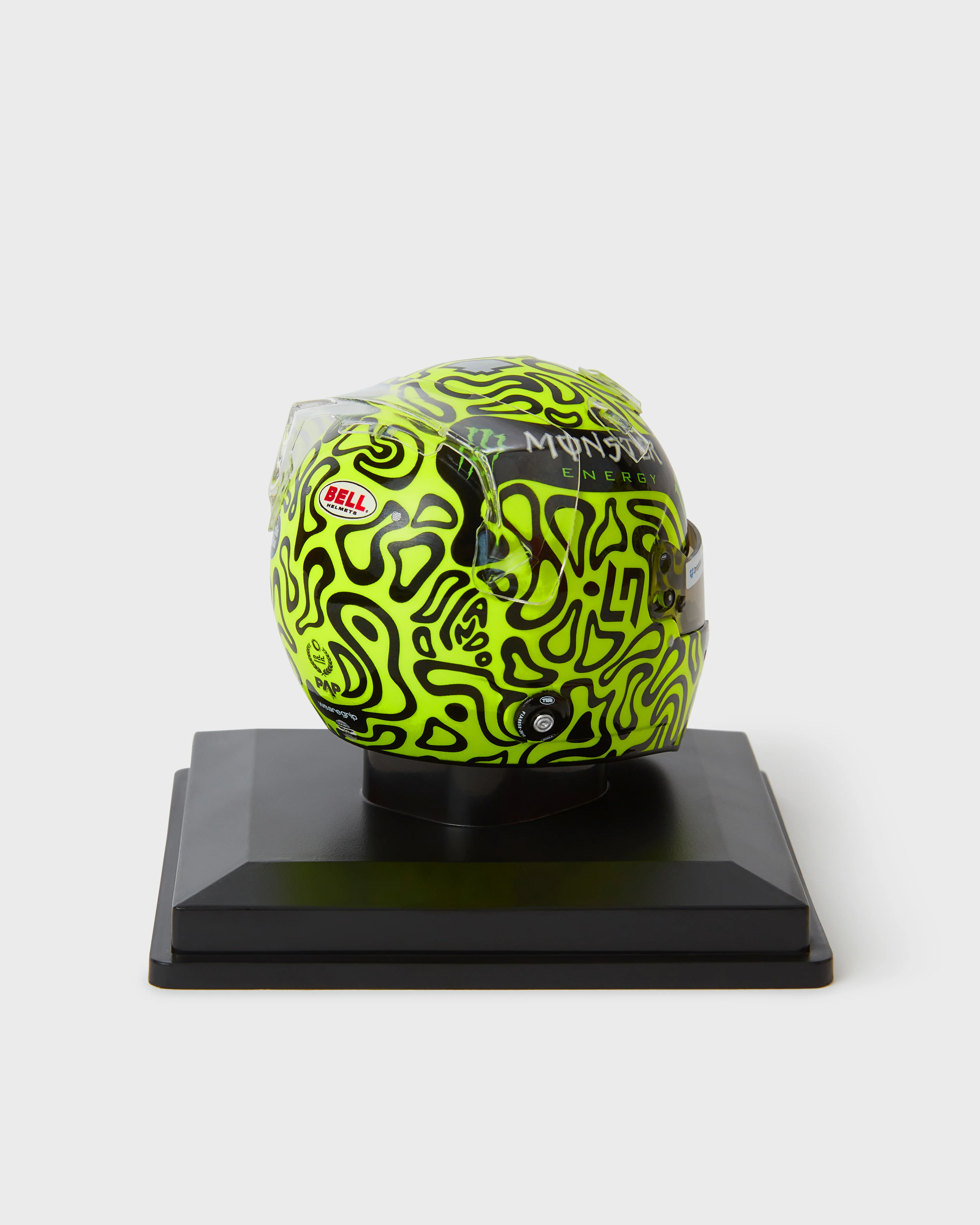 Images are of Lando's full scale 2025 helmet finer details, sponsor logos and their position may vary on the replicas. The video shown is of the 2024 Season Mini, and is provided only as a reference for size, packaging, and movement.